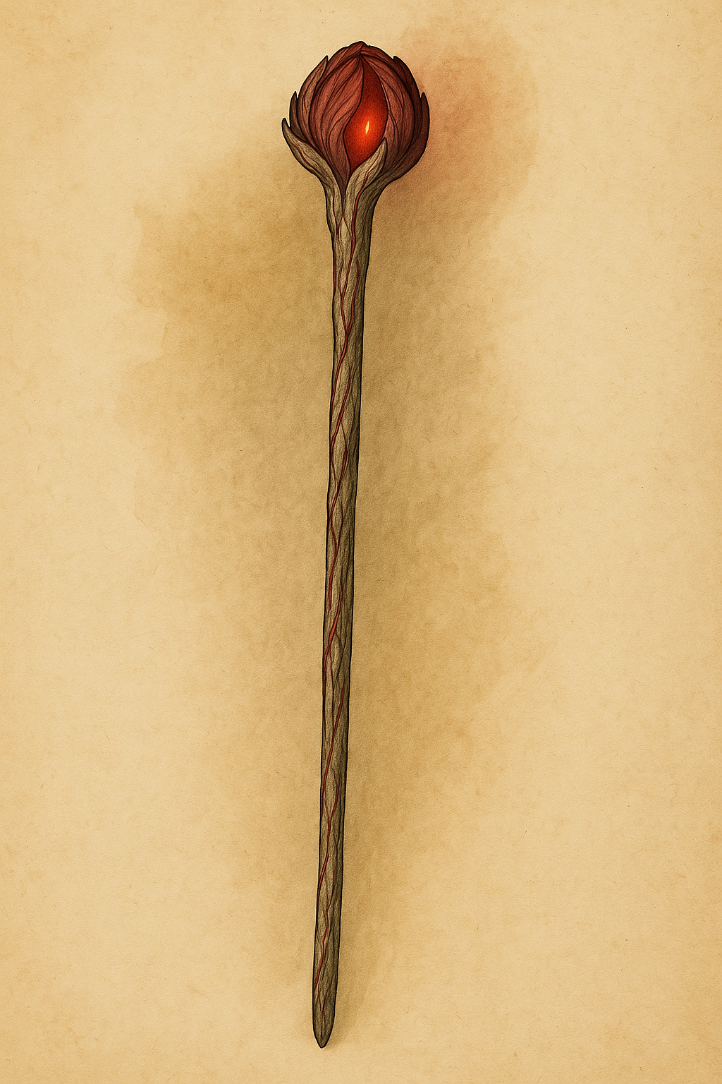This quarterstaff is made from the wood of a blood willow. Its wood is a pale gray which has veins of red running throughout its body. The head of the quarterstaff is a bulging and swollen red amorphous bulb, like that of an unblooming flower. Its petals are shut and a dim red glow can be seen within and a slight heartbeat can be felt running through the staff, as if it was alive.